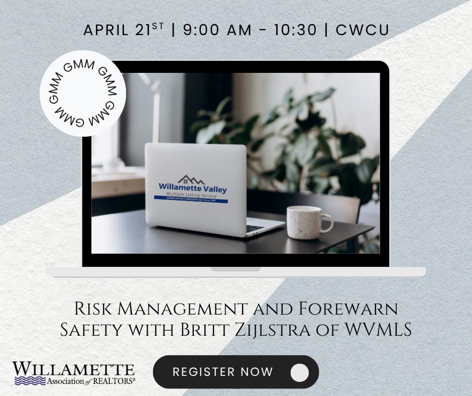 🚨 April GMM – Risk Management & REALTOR® Safety Join us for our April General Membership Meeting on April 21st at Central Willamette Credit Union as we focus on risk management and REALTOR® safety. We’ll be highlighting FOREWARN, a powerful safety and intelligence tool available to members that helps you verify identities and better protect yourself when working with new clients. This meeting will provide practical insights on how to reduce risk in your day-to-day business while making the most of the safety resources available to you as a REALTOR®. 📍 Location: Central Willamette Credit Union 📅 Date: April 21 ⏰ Networking begins at 8:30 AM | Meeting starts at 9:00 AM Don’t miss this opportunity to learn how to protect yourself, your business, and your clients.